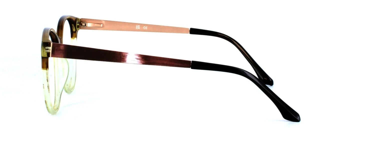The crystal brown upper exudes warmth and elegance, while the crystal green lower adds a touch of vibrancy. The frame is perfectly complemented by brown patterned metal sprung hinged arms, which provide a secure fit and add subtle texture.