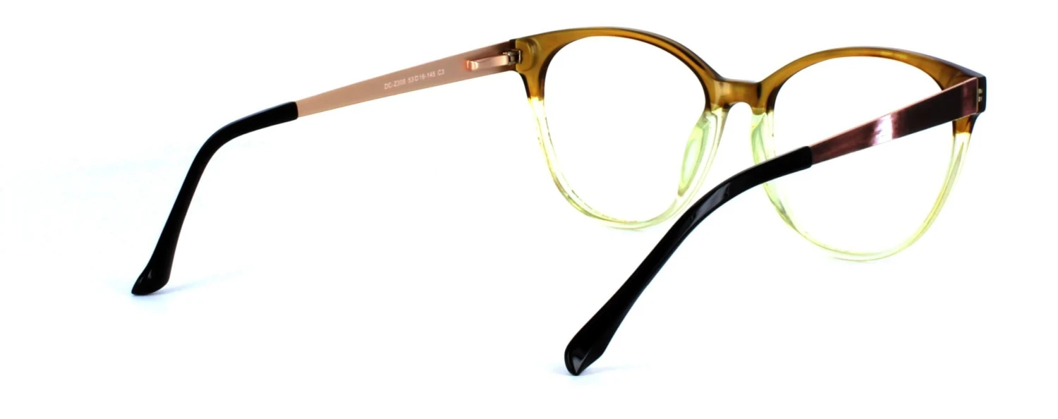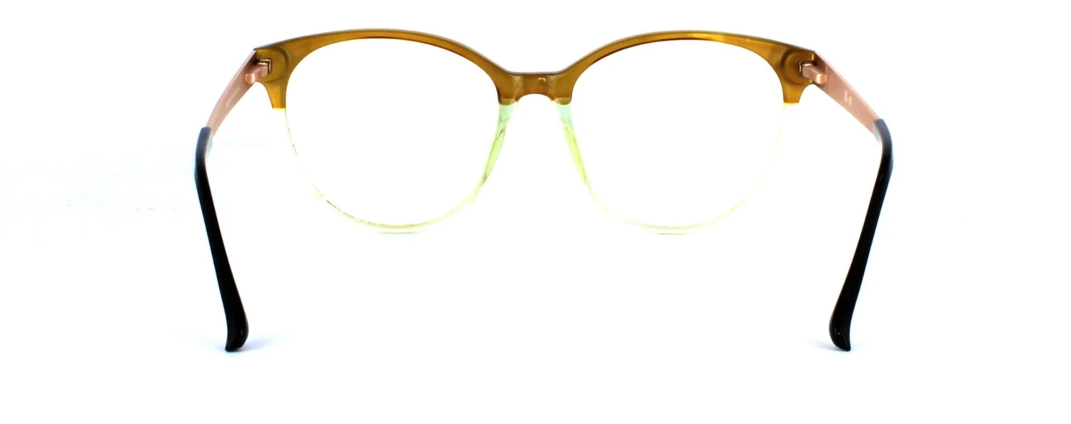 Make a fashion statement with this stylish ladies’ round cat-eye acetate frame. It features a captivating design with crystal brown upper and crystal green lower sections.