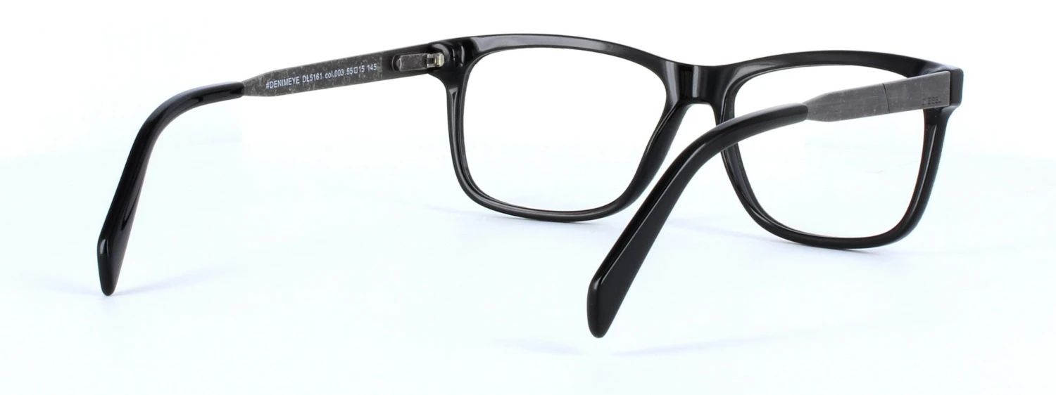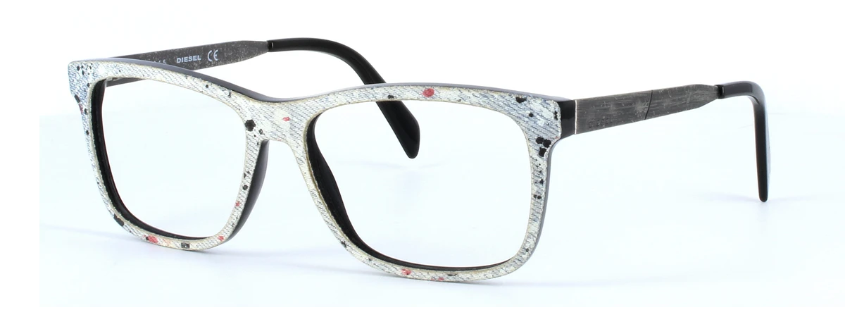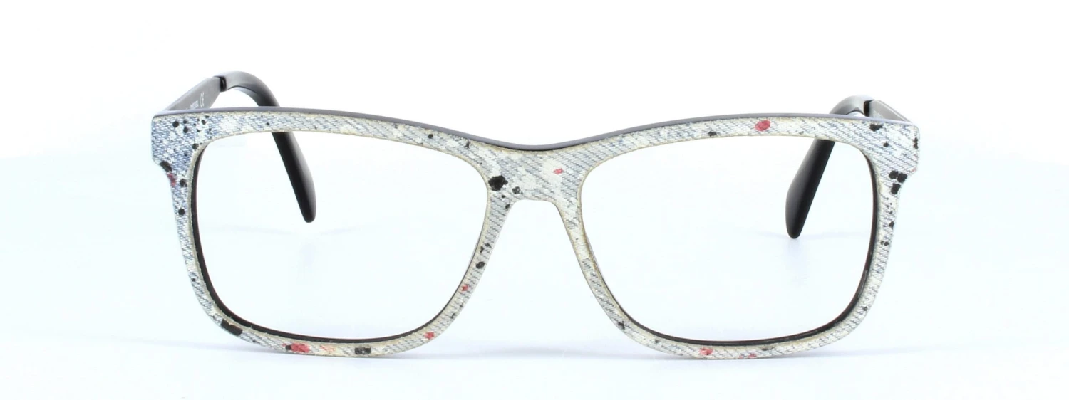Unisex square/rectangular shaped full rim acetate. Paint splashed light denim front face with stressed metal arms.