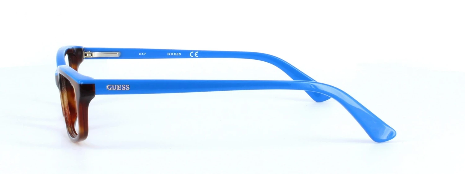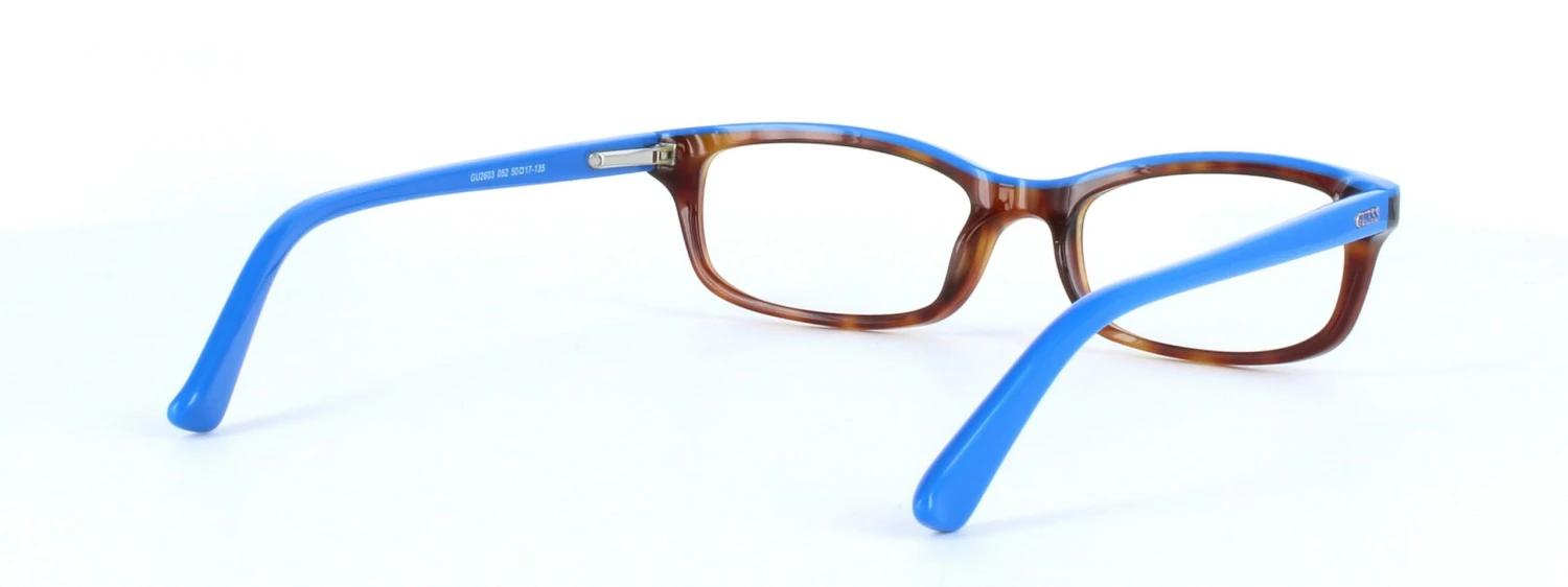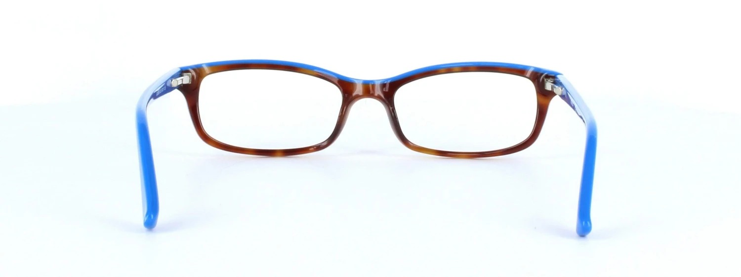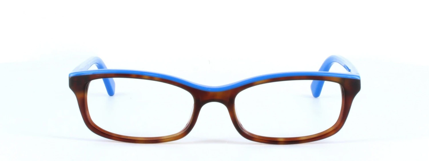 Ladies oval/rectangular shaped full rim acetate. Tortoise with blue top and blue sprung hinged arms.