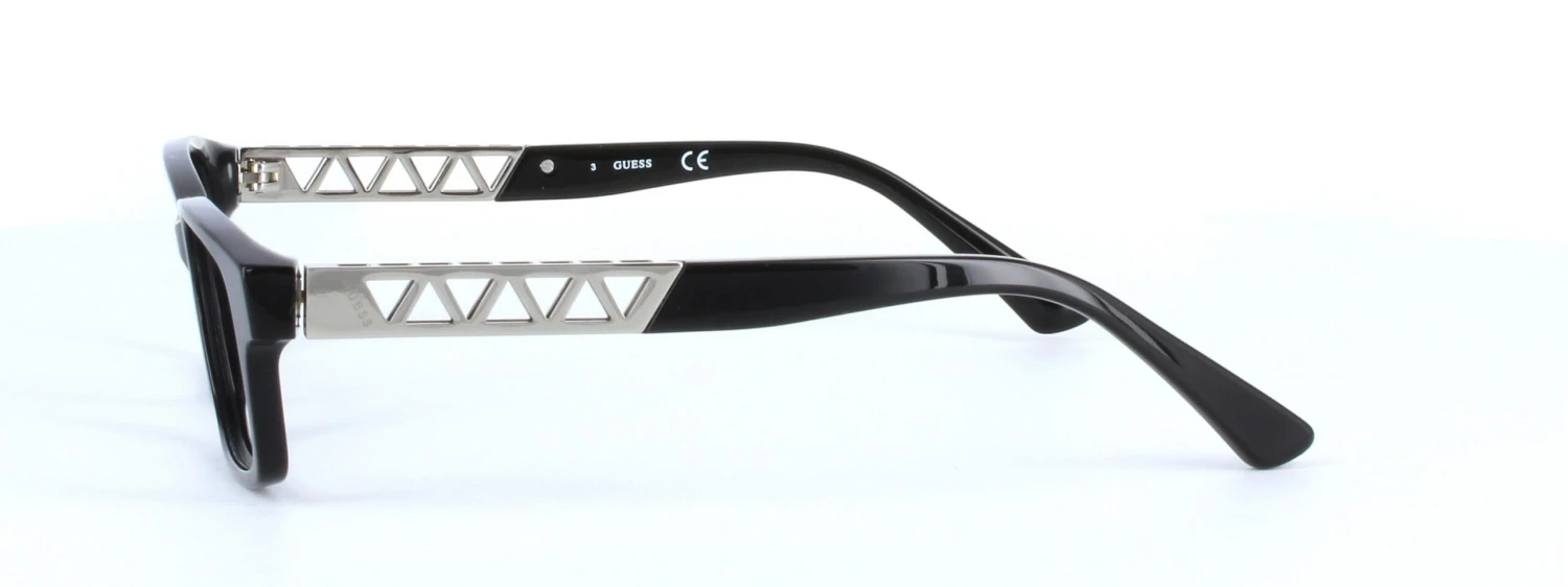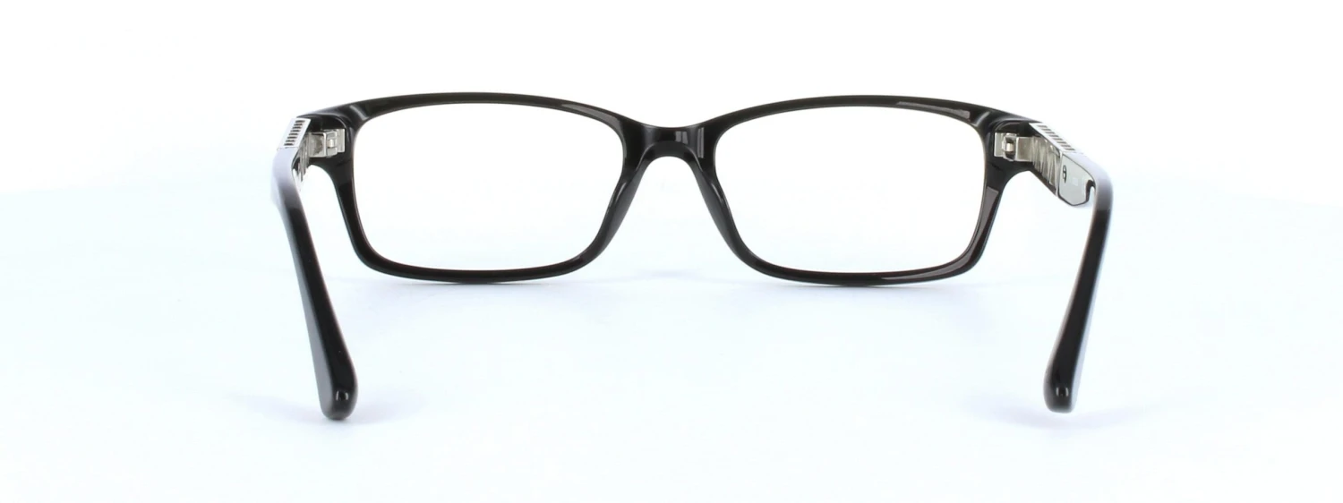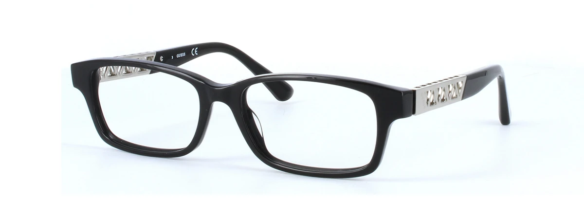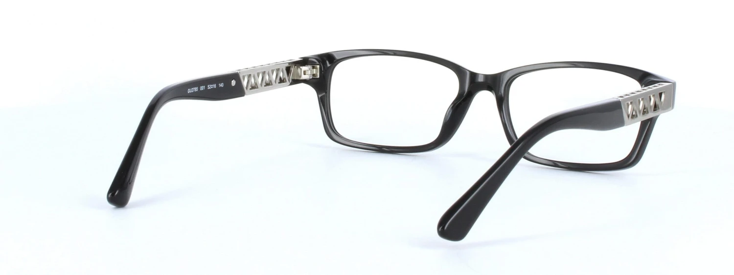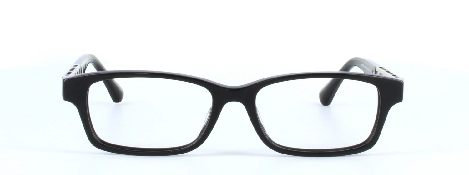 Ladies oval/rectangular shaped full rim acetate. Shiny black face & decorative metal temple leading to smooth acetate arms.ย
