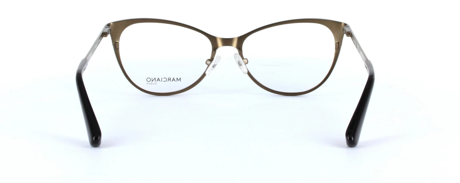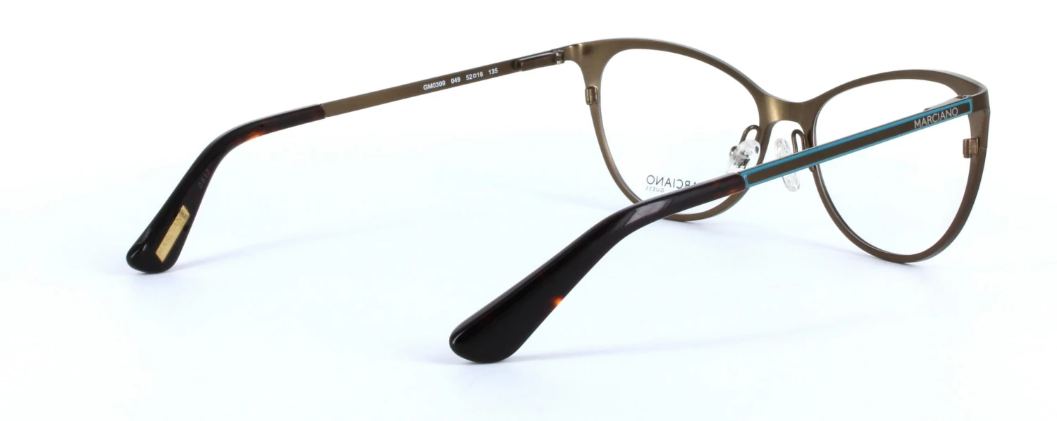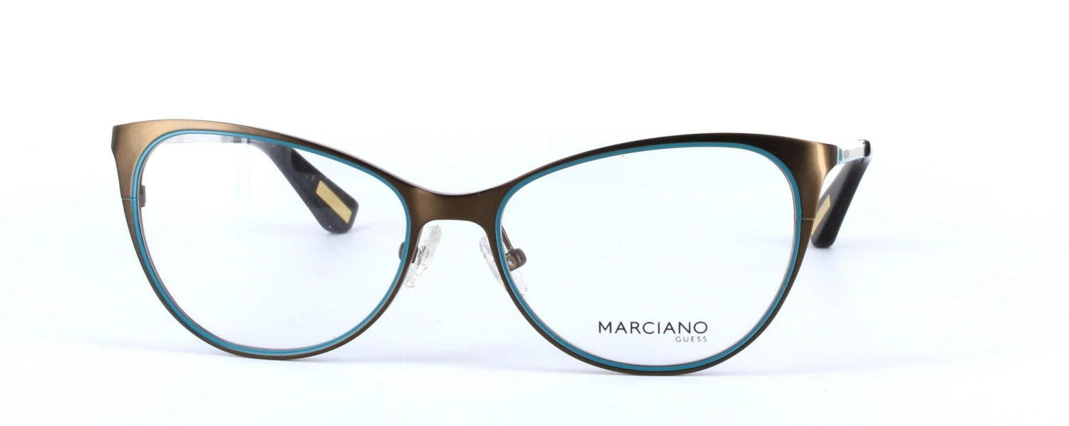 Ladies oval shaped metal full rim. Slim cat eye. Bronze with slim turquoise lining strip. Slim bronze arm with turquoise trim. Dark tortoise arm ends withh gold logo inside tip.