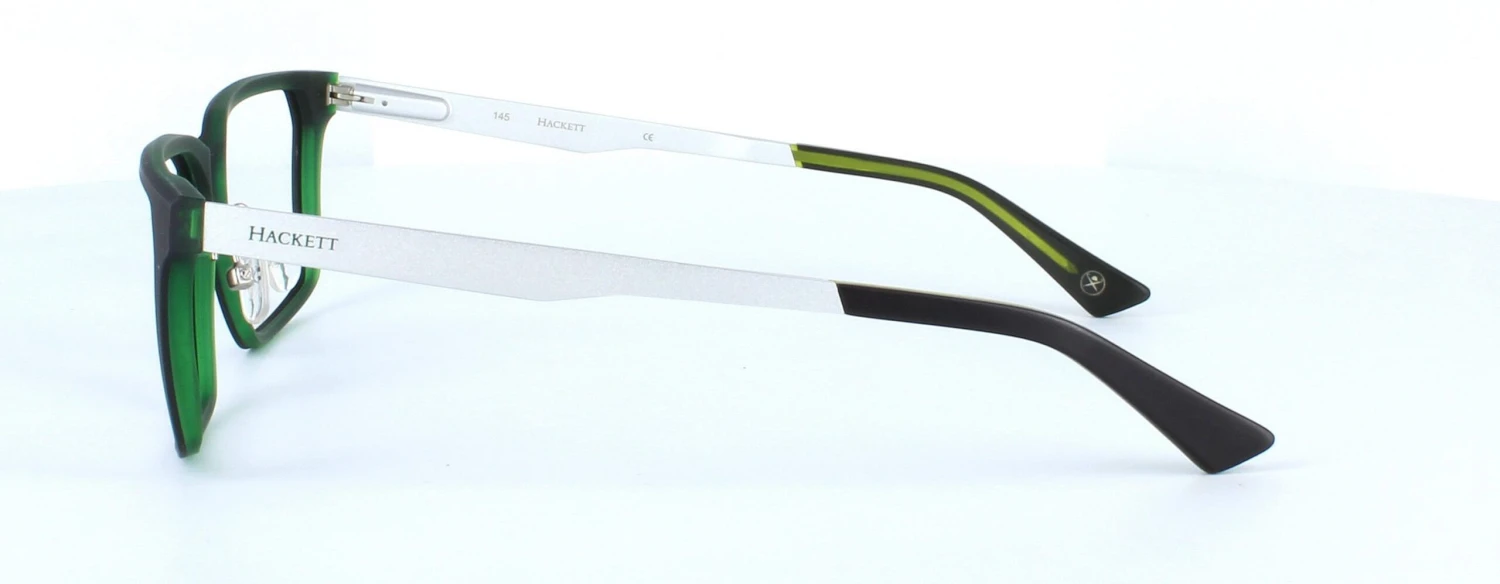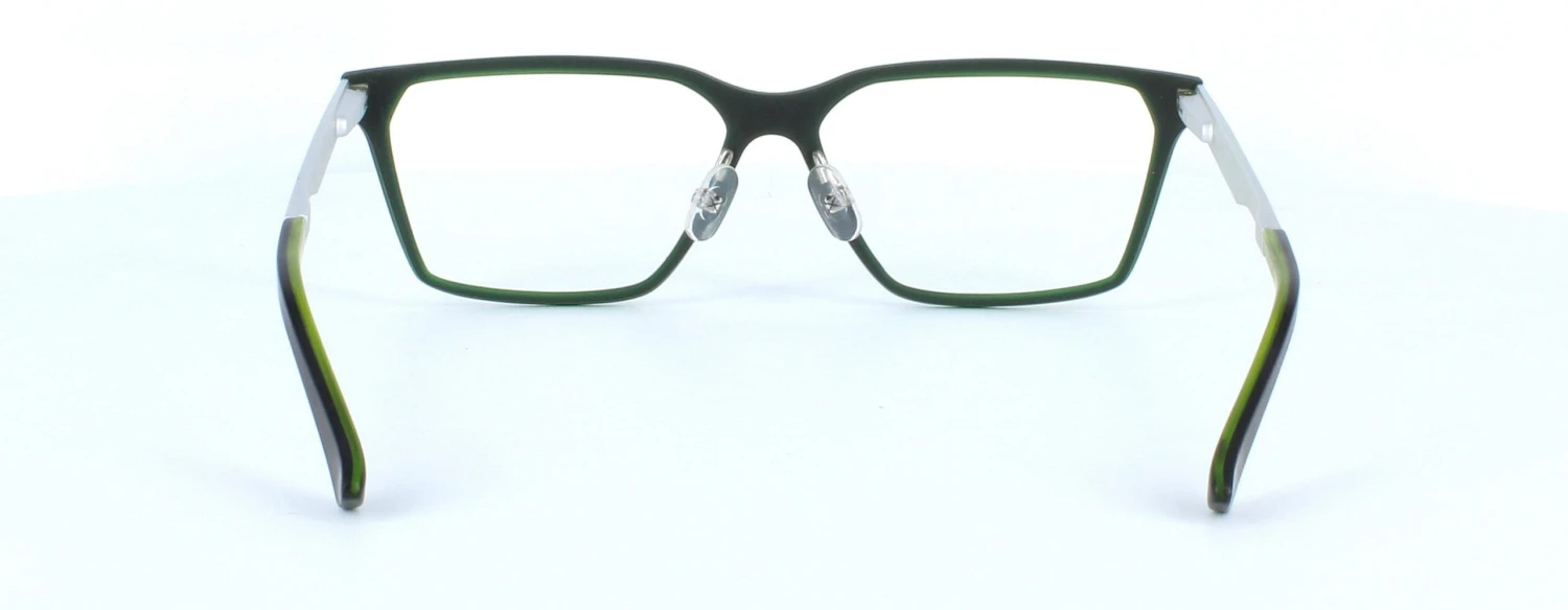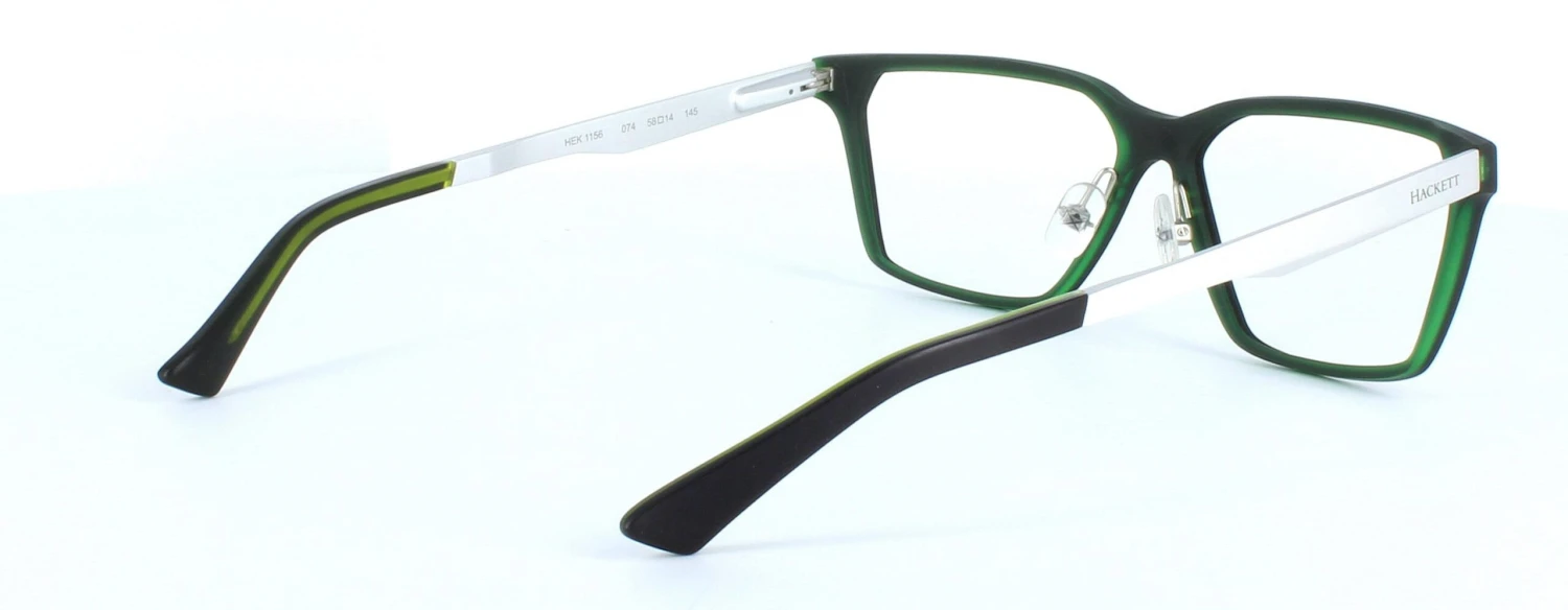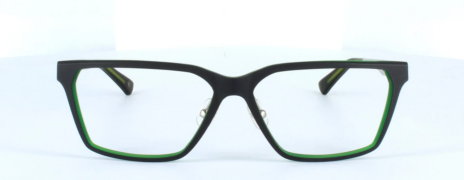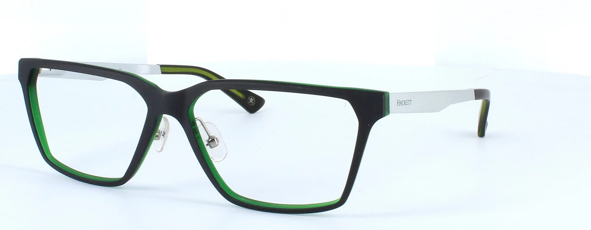 Male rectangular shaped full rim acetate. Black/green face. Silver metal arms. Black/green tips.