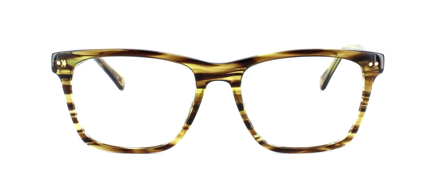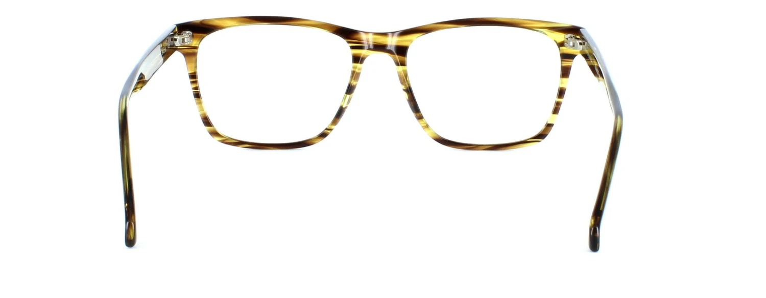 Here presented in striped brown is a unisex acetate frame with rectangular shaped lenses