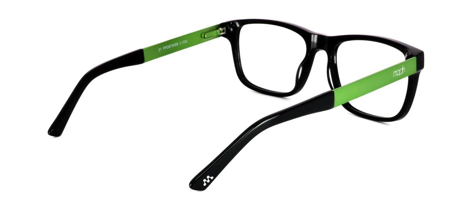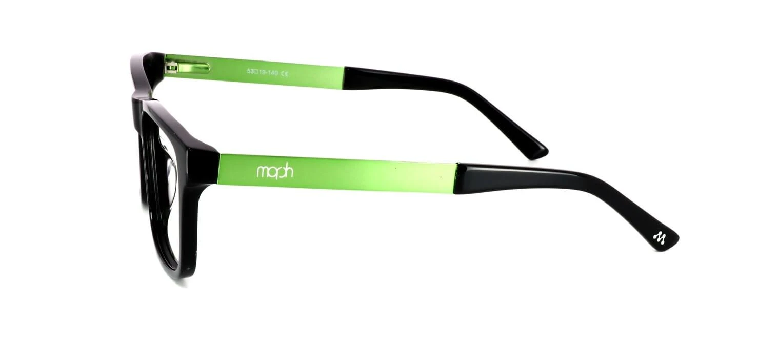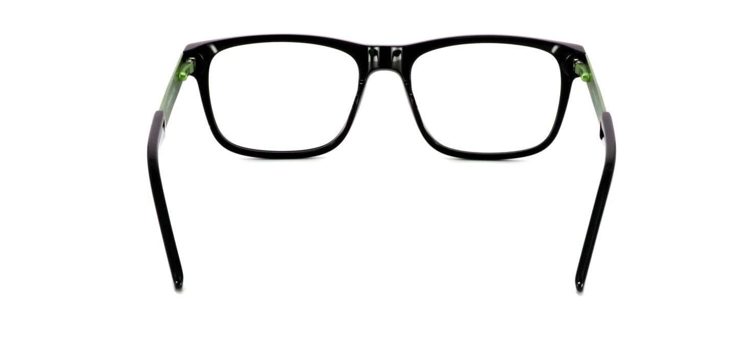 Smooth acetate shiny black front face with eye catching metallic green arms.
